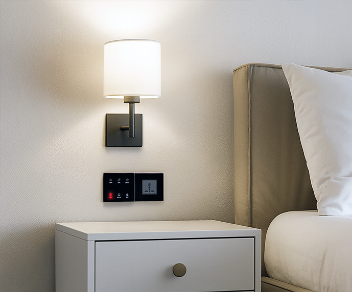 Guests interact with the room through premium glass or metal touch controllers that bring elegance to any interior. Icon-based buttons make functions easy to understand, without language barriers. These controllers can operate lighting, curtains, temperature, courtesy services, and scenes, providing a unified control point. The customizable design ensures that hotels can match their brand identity