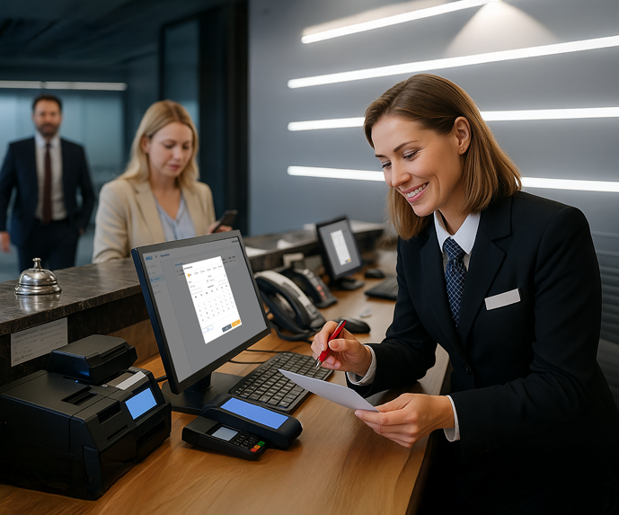 At the heart of the GRMS is a central hotel server that connects all rooms to reception. Staff can see real-time data including: room occupancy, temperature, energy usage, door status, DND/MUR requests, and device alarms. The reception desk can control room features, trigger scenes, assign keys, and even assist guests remotely.