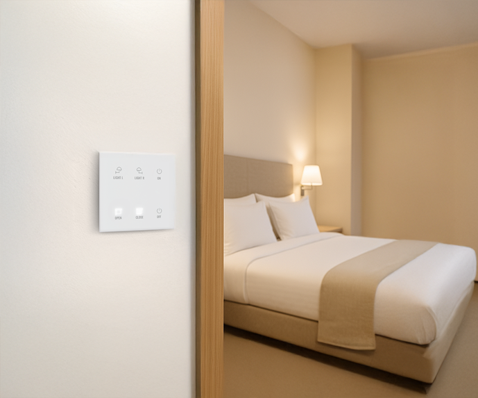 Once the door is smart, the next step is to bring the same comfort inside the room. HRESK offers a family of classic wall and glass controllers so guests can easily control lights, scenes, curtains and other functions right from the entrance, bedside or desk.